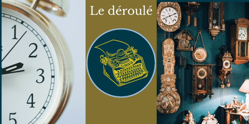 À noter : Ces données ne sont notées qu’à titre indicatif, puisqu’à la première rencontre, nous déterminerons ensemble le temps nécessaire à l’élaboration de votre projet, même si le nombre de séances peut tout à fait changer au cours de l’avancement ; soit que vous décidiez de raccourcir le texte, soit d’arrêter l’écriture de votre récit, soit d’y ajouter des éléments supplémentaires.